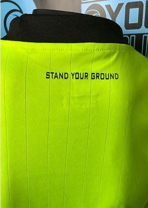Logo: West Coast on Right Shoulder, Stand Your Ground on Lower left, Wave Logo on Center of Shirt and Left Sleeve.